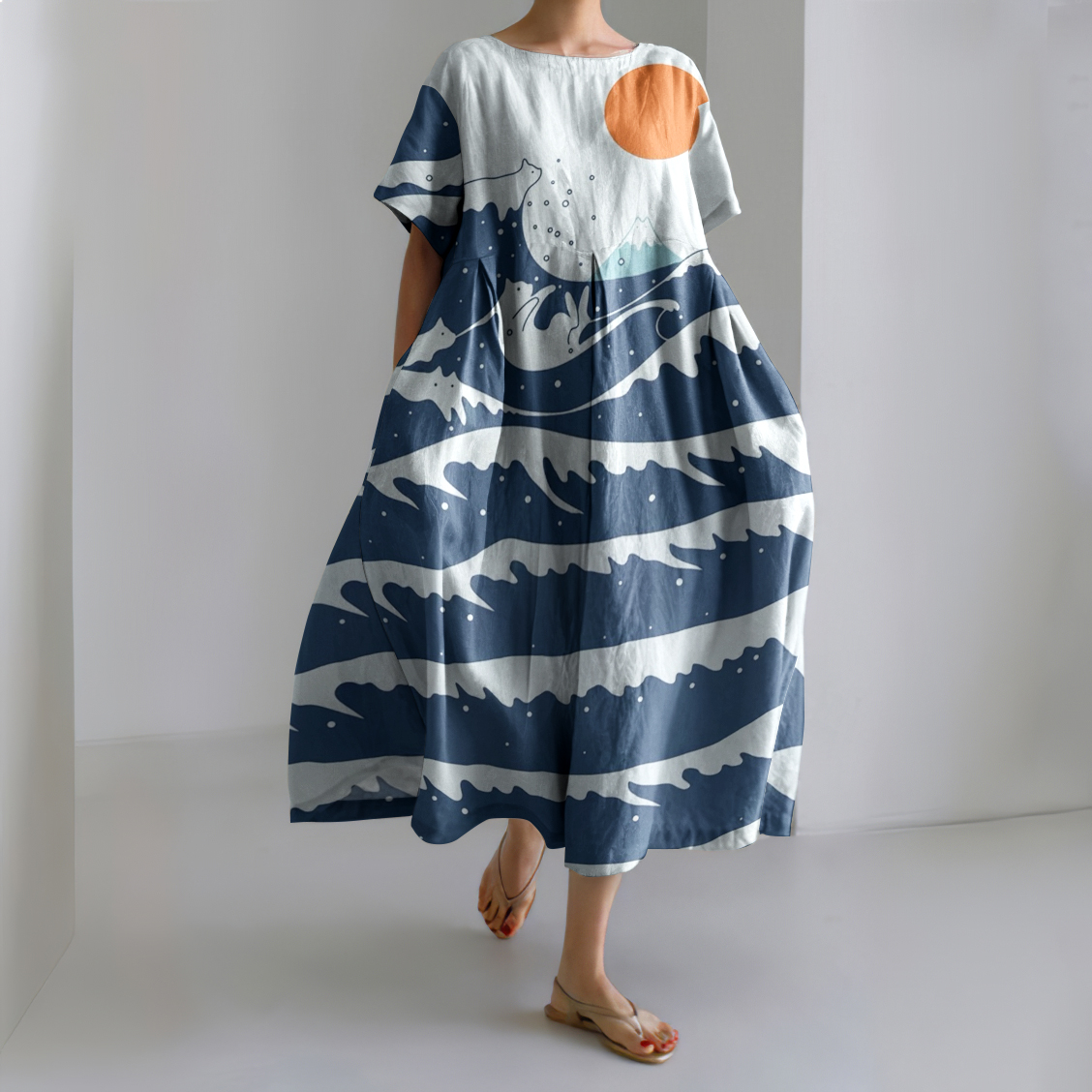 Abstract Creative Cute Cat In Wave Painting Art Linen Blend Dress