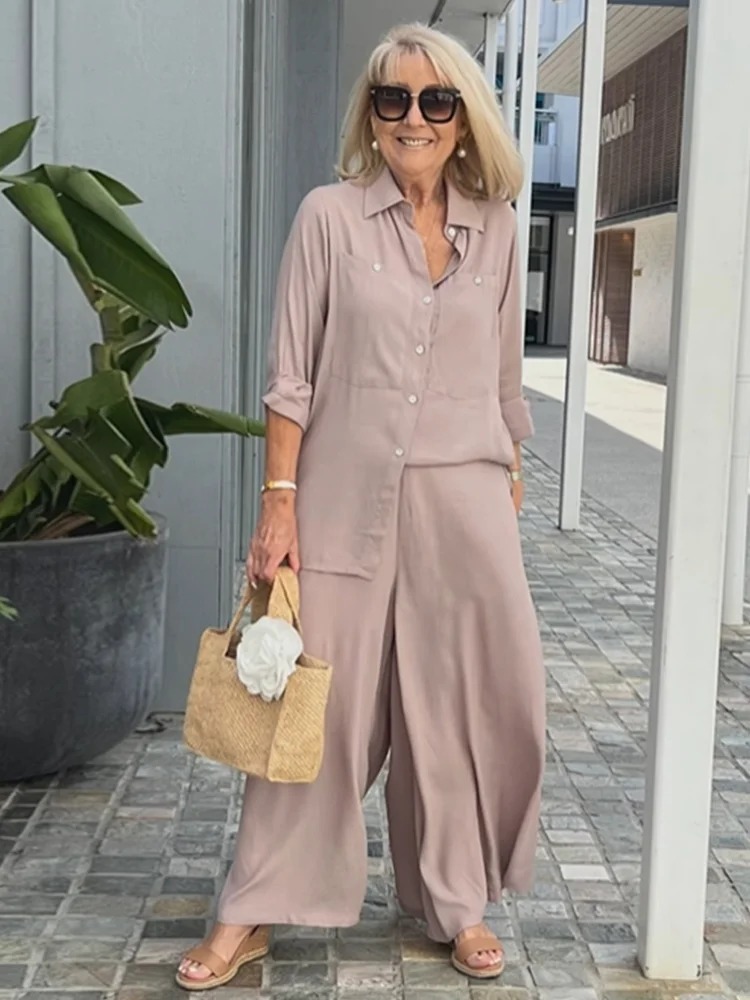 Loose casual solid color lapel neck long-sleeved shirt wide-leg pants set