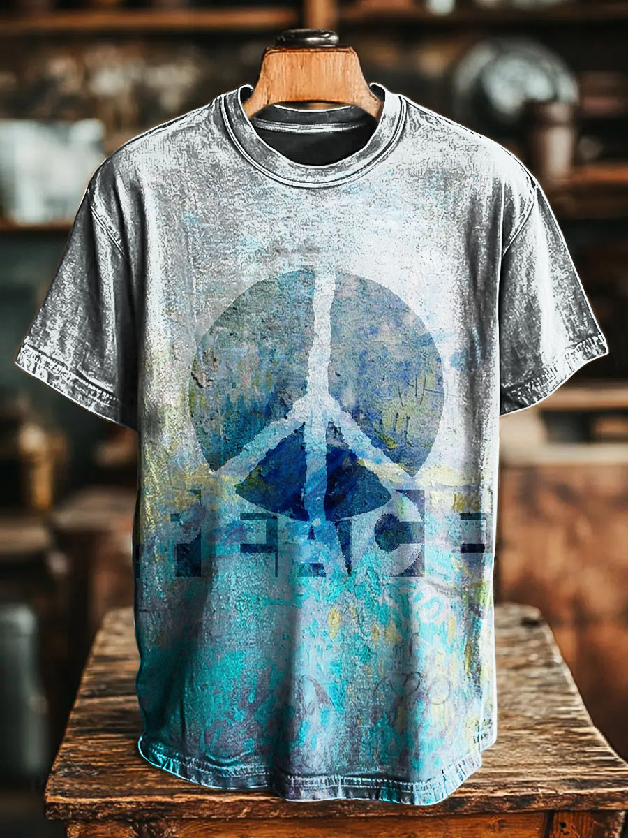 Blue Gradation Hippie and Peace Vintage Art Print Casual T-shirt For Men And Women
