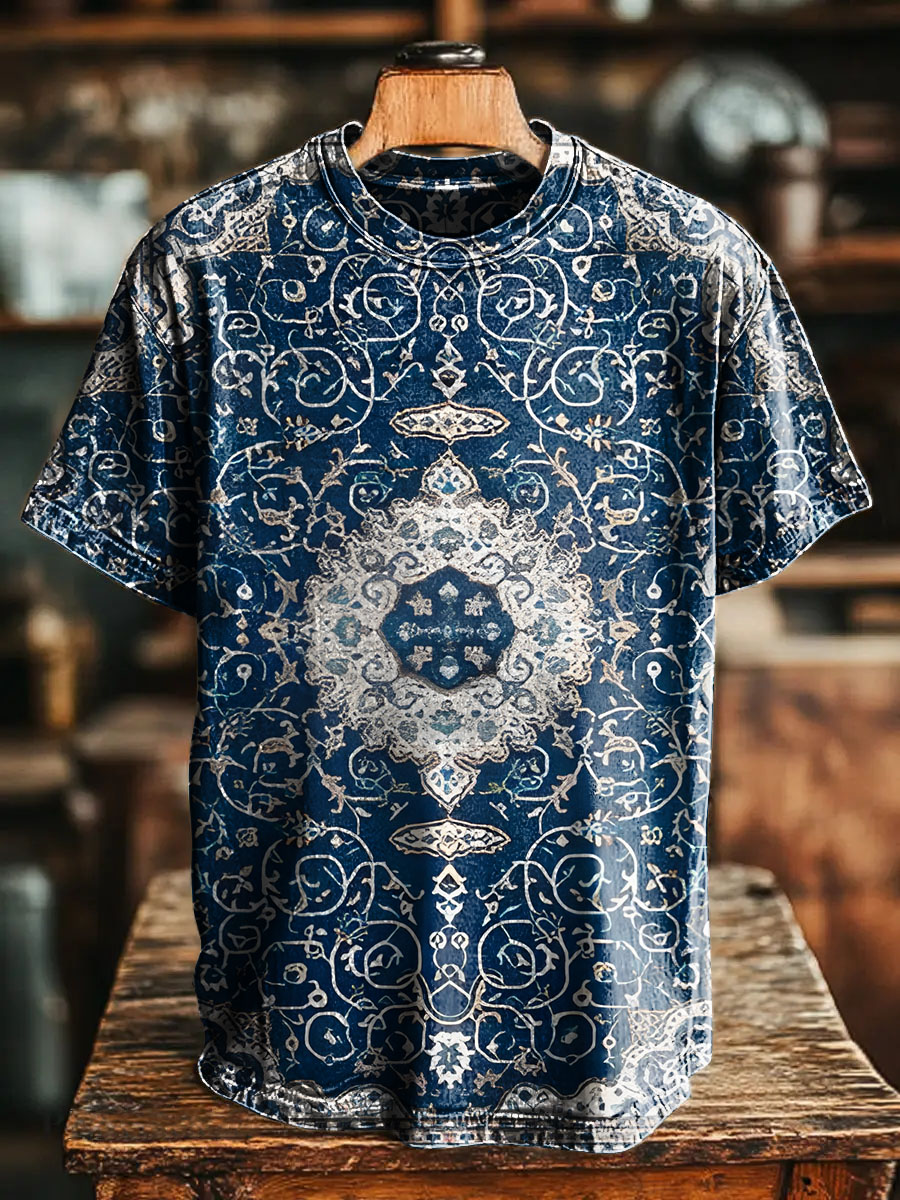 Blue Retro National Flowers pattern Vintage Art Print Casual T-shirt For Men And Women