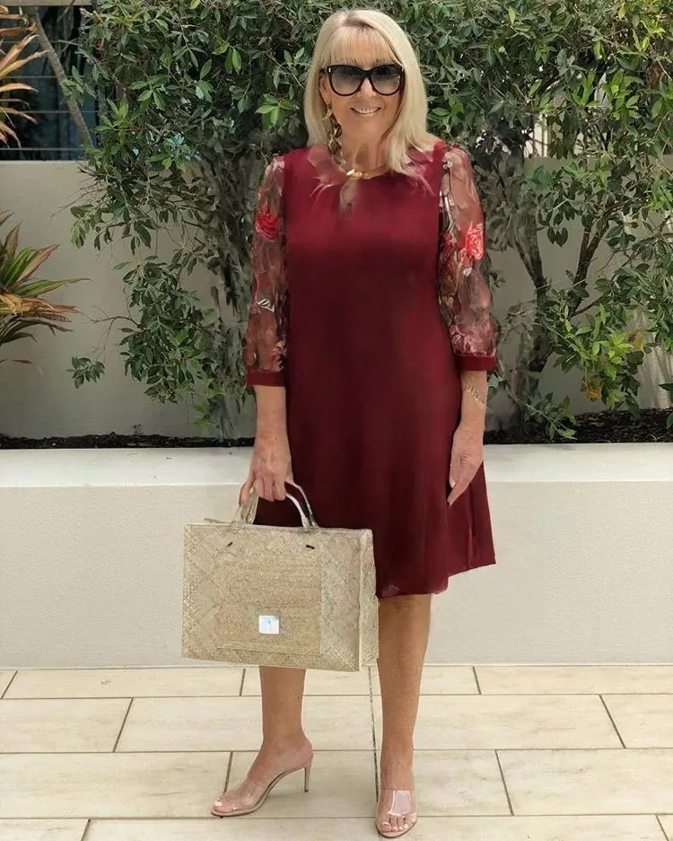 Contrast Mesh Floral Print Dress, Elegant Keyhole Neckline 3/4 Sleeve Dress, Women's Clothing
