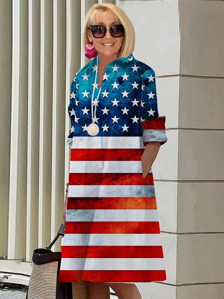 American Flag Printed Long Sleeve Pocket Shirt Dress