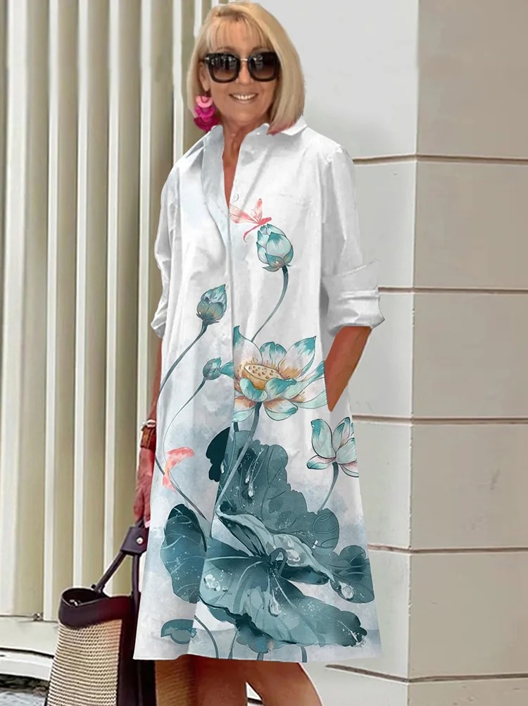 Retro Style Women Floral Long Sleeve Pocket Shirt Dress