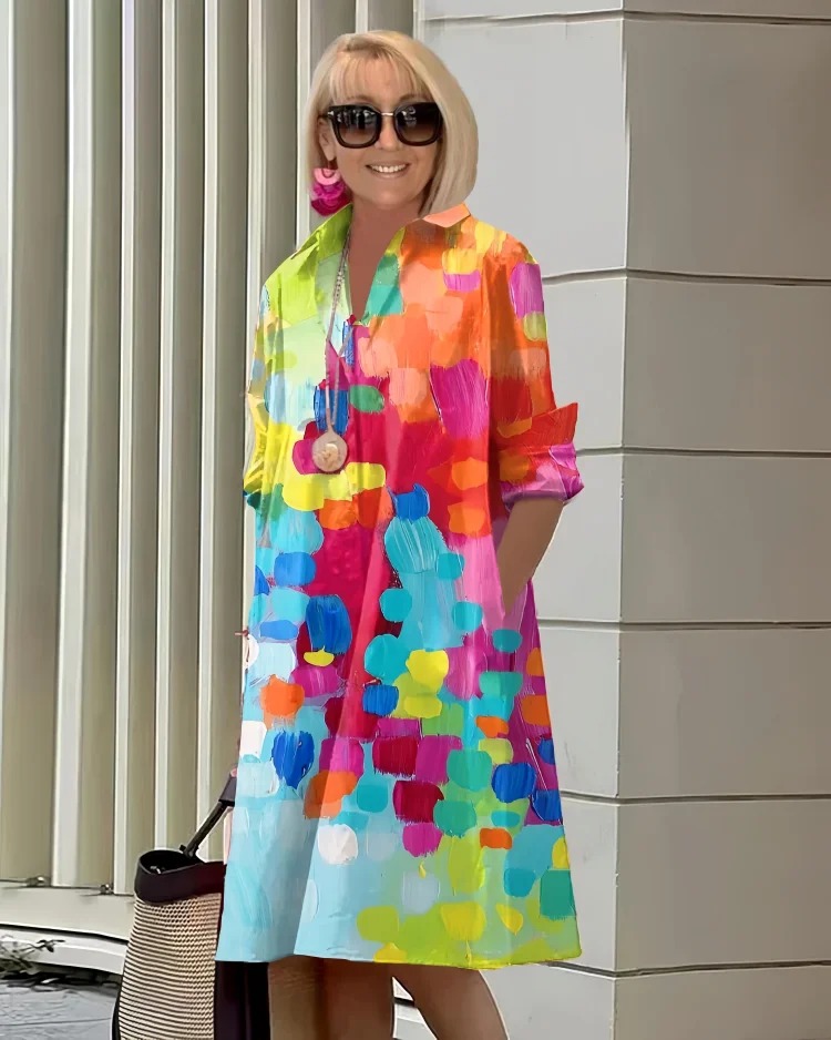 Long Sleeve Printed Pocket Shirt Dress
