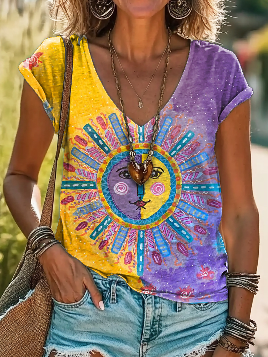 Face Sun Colorblock Art Print 100% Cotton V-Neck T-Shirt