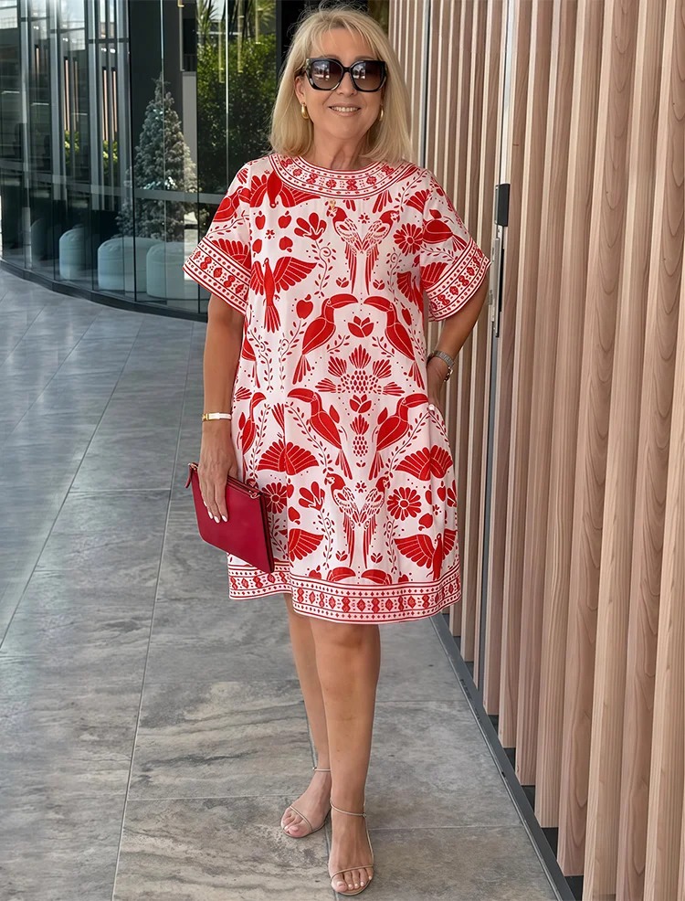 Fashion Bird and Plant Print Short Sleeve Dress