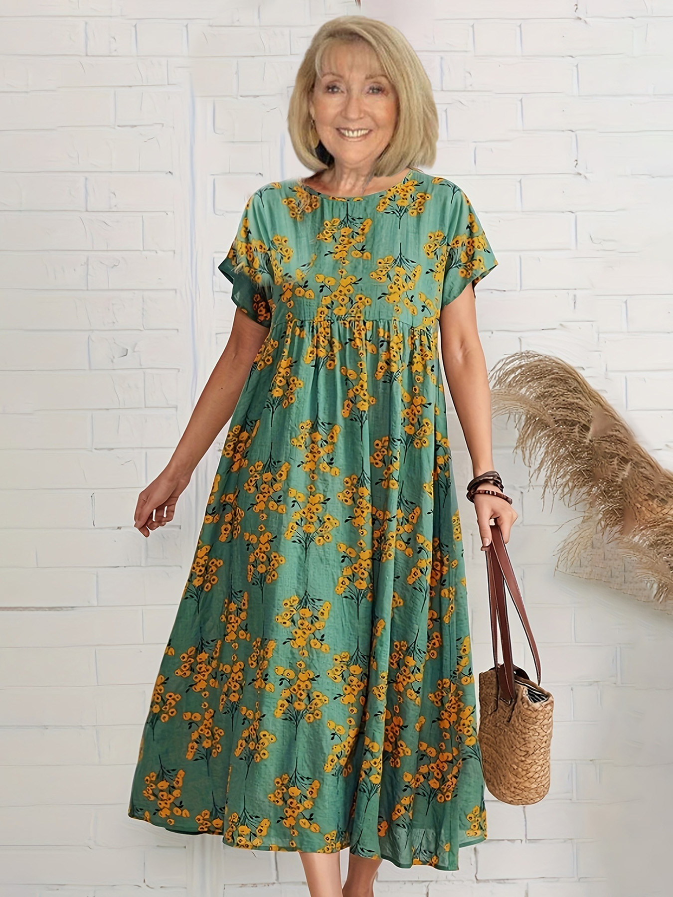 Floral Print Smocked Loose Dress, Vintage Crew Neck Short Sleeve Dress For Spring & Summer, Women's Clothing