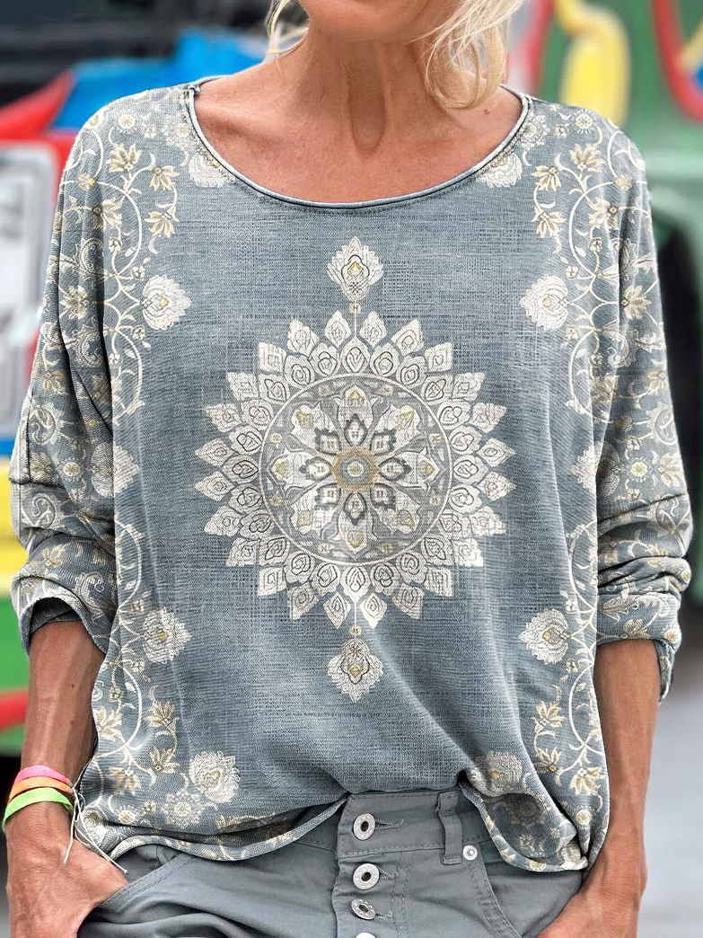 Light blue National style Flowers Women's Art Print Casual Long Sleeve T-shirt