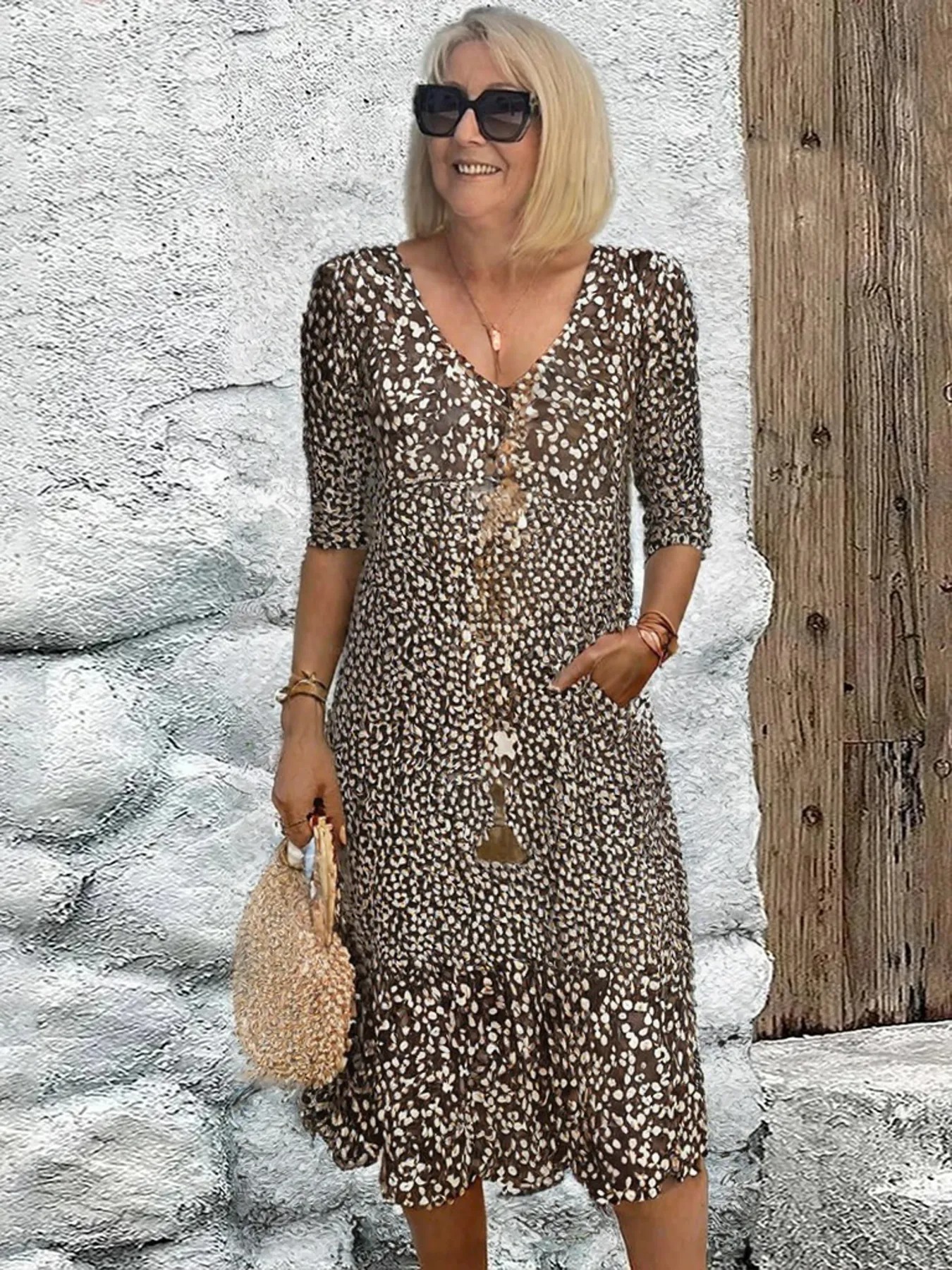 Bohemian Floral Print Half Sleeve V-neck Mid-Length Dress