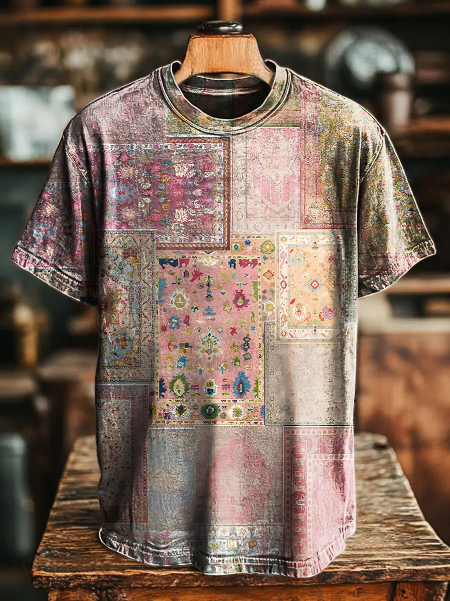 Pink Patchwork National Flowers pattern Vintage Art Print Casual T-shirt For Men And Women