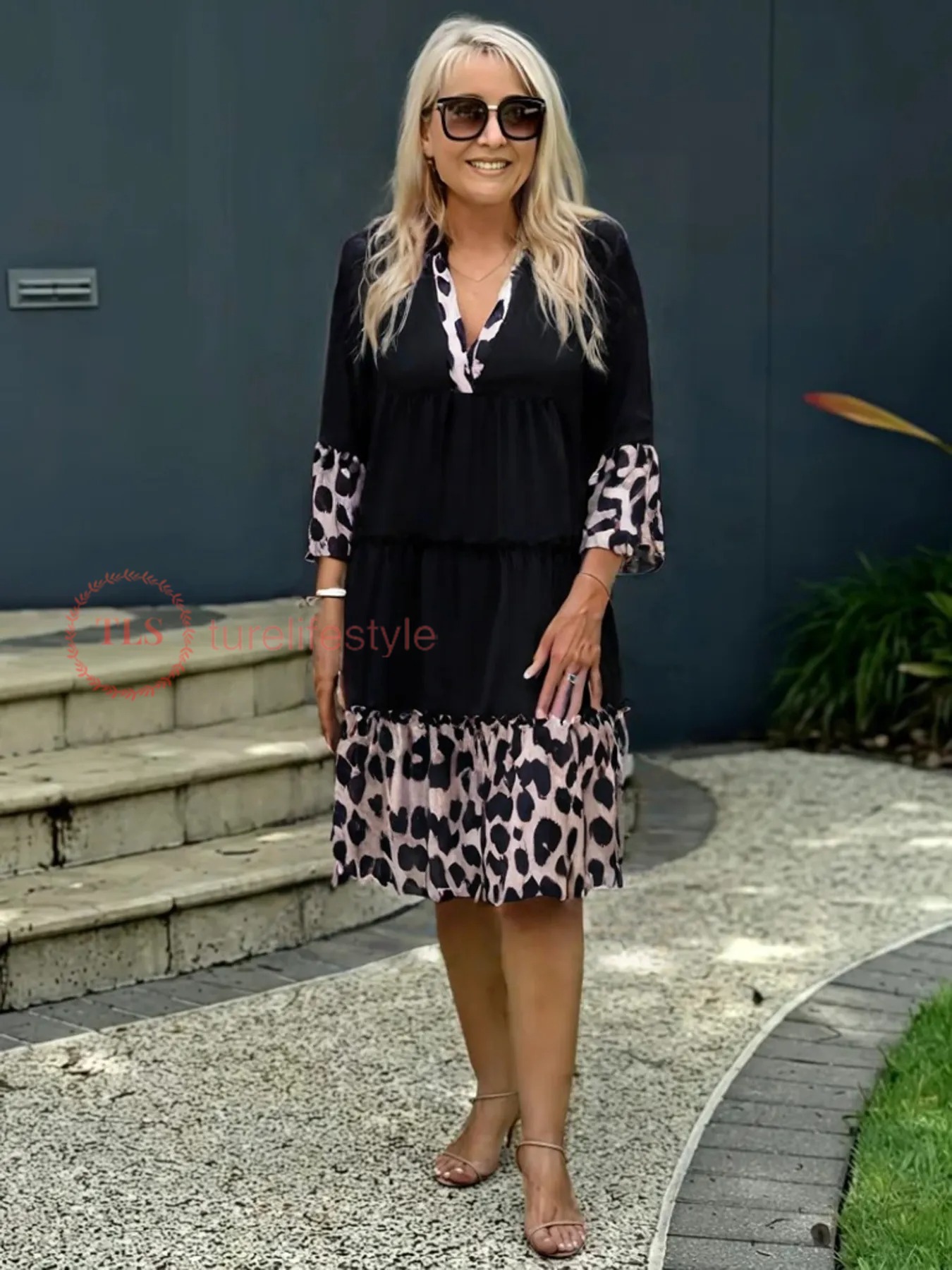 [Popular Choice] Elegant Leopard Print Long Sleeve Dress with Contrast Color, V-Neck, Non-Stretch Polyester Fabric - Machine Washable
