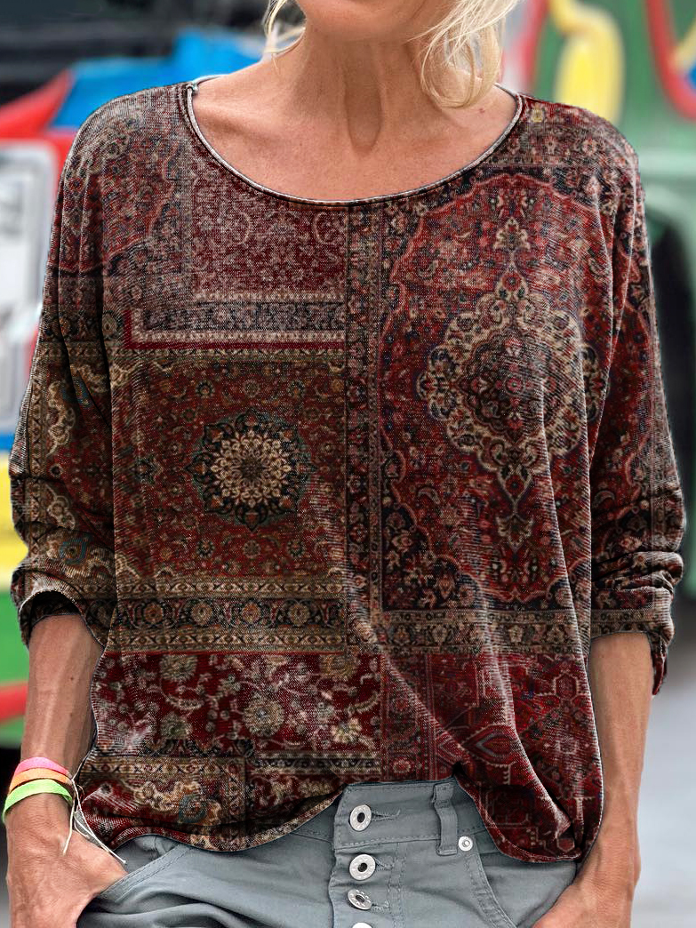 Red National Flower Patchwork pattern Women's Art Print Casual Long Sleeve T-shirt