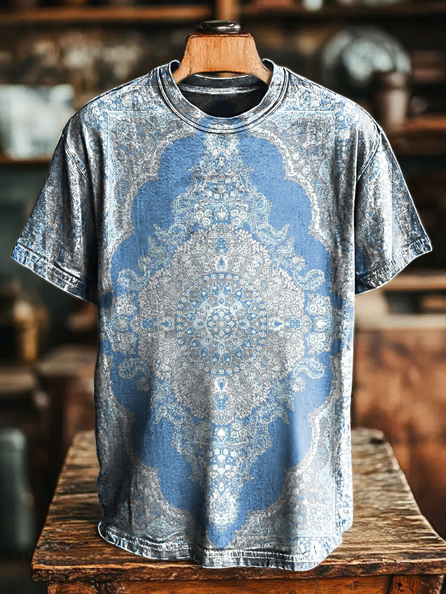 Retro Blue National Floral pattern Vintage Art Print Casual T-shirt For Men And Women