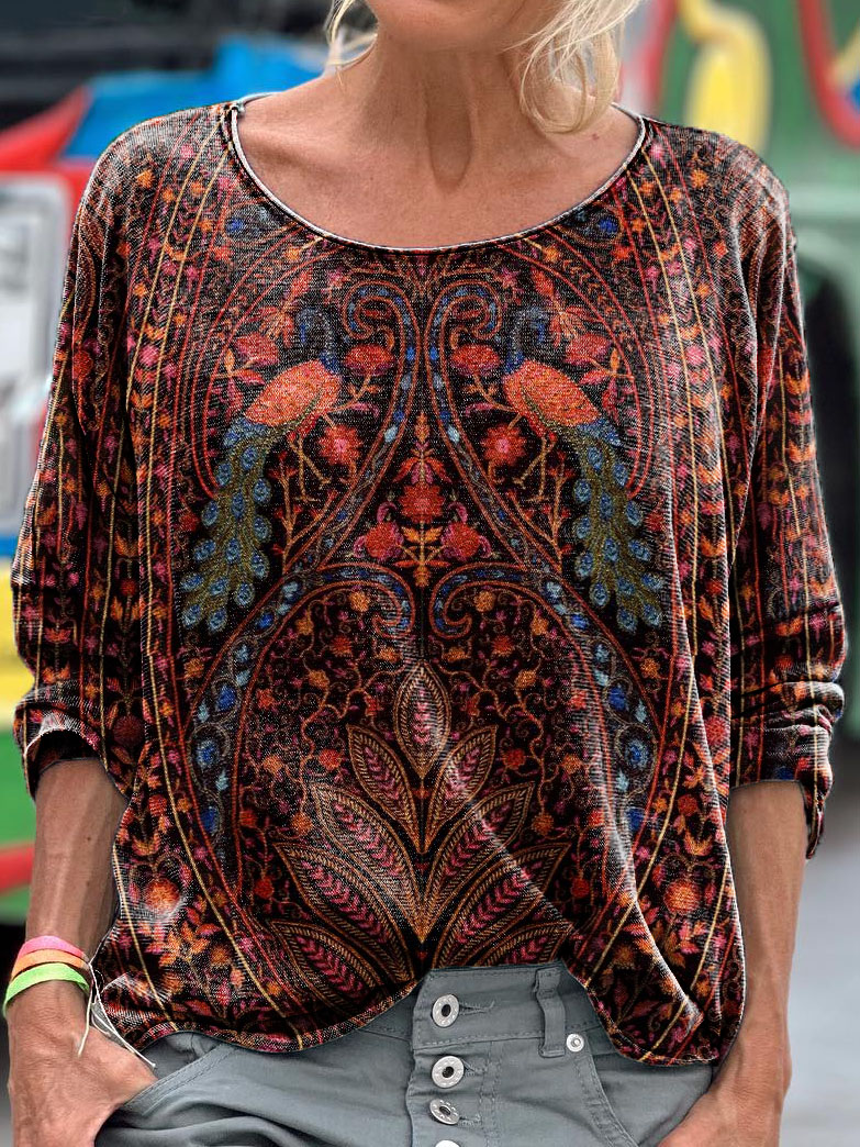 Retro Ethnic Floral Peacock Pattern Art Print Casual Long Sleeve T-shirt