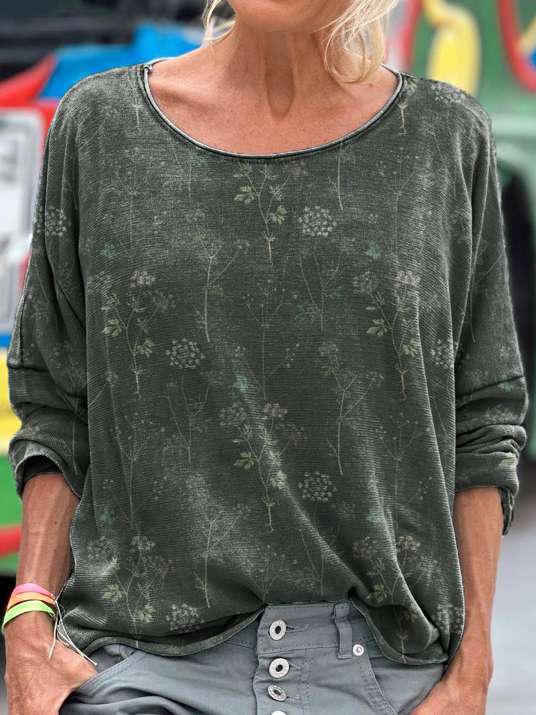 Retro Green Ethnic Style Flowers Women's Art Print Casual Long Sleeve T-shirt