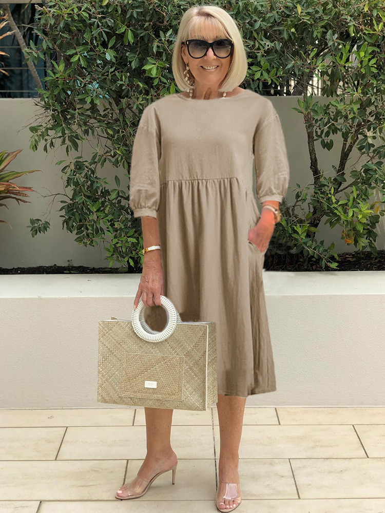 Solid Color Lantern Sleeve Cotton Pocket Midi Tunic Dress