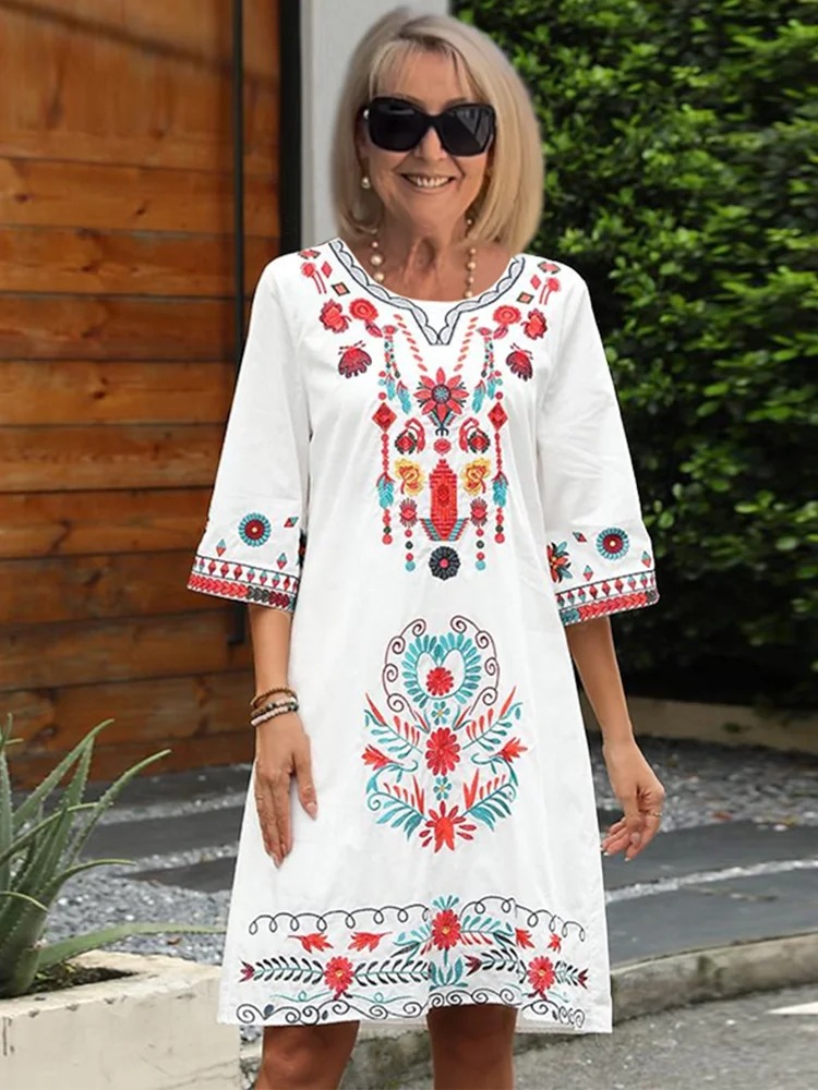 Women's A Line Dress Mini Dress Cotton Embroidered Vacation Elegant Casual Crew Neck 3/4 Length Sleeve Black White Color