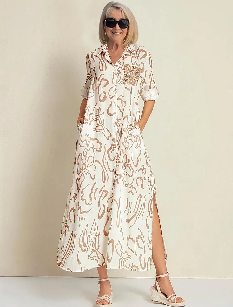 Sequin Apricot Curve Pocket Roll Up Sleeve Maxi Shirt Dress