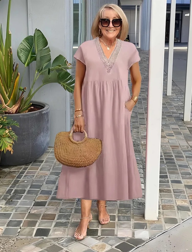 Lace V-neck Cotton and Linen Pocket Tunic Dress