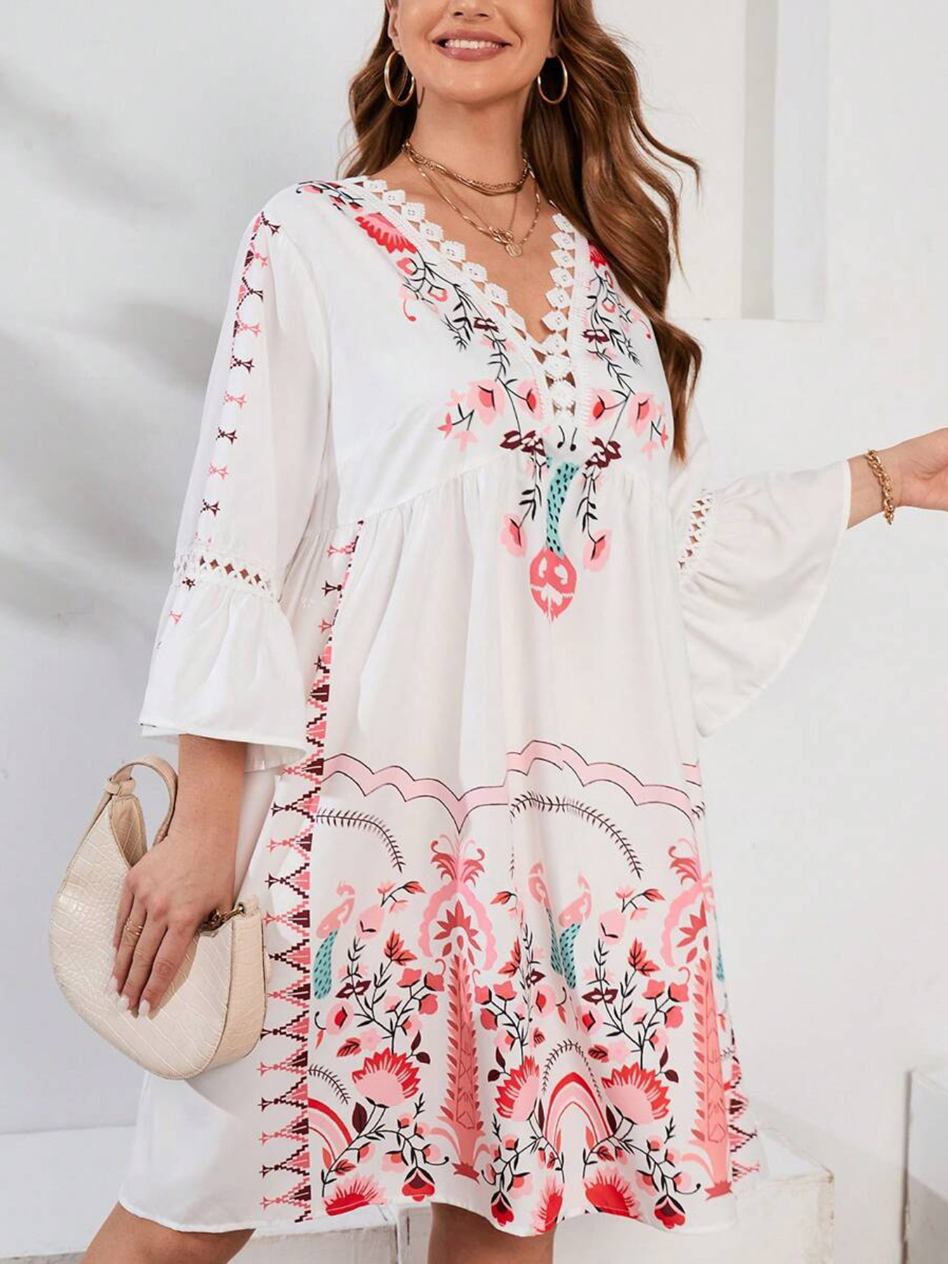 V-neck Printed Lace Stitching Bohemian Casual Vacation Style Dress