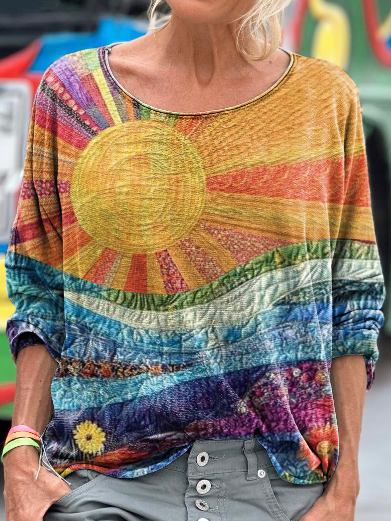 Sun Abstract Patchwork Vintage Art Women's Art Print Casual Long Sleeve T-shirt