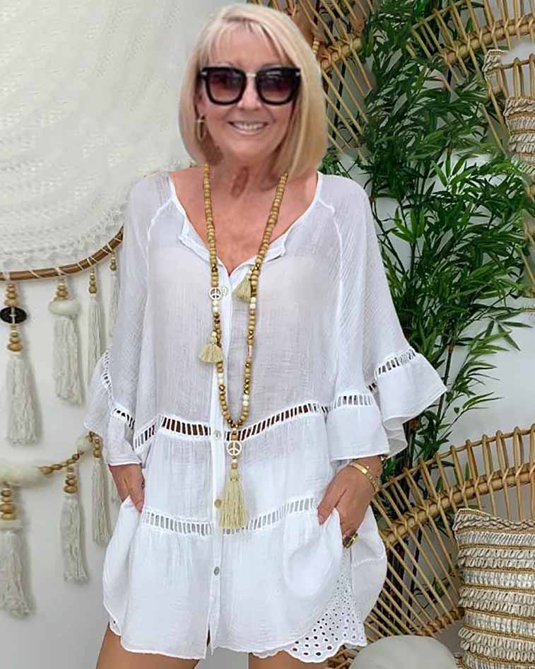 Three-Quarter Sleeve Cotton and Linen V-neck Buttons Hollow-out Large Dress