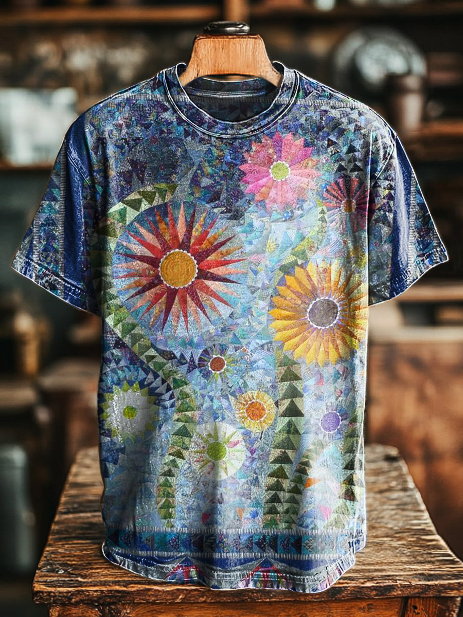 Unisex Vintage Floral Art Printed Casual Round Neck Short Sleeve T-Shirt