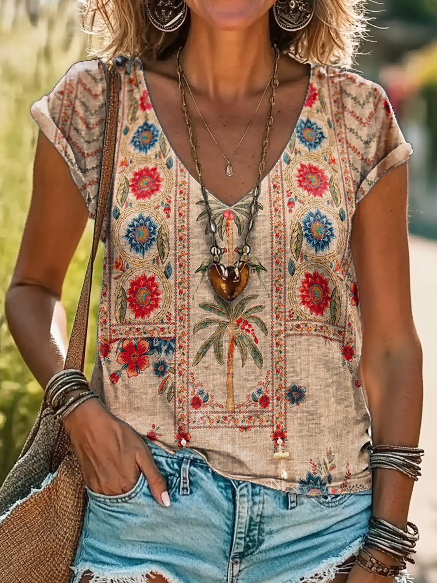 Vintage Bohemian Floral Art Print 100%Cotton V-neck T-Shirt