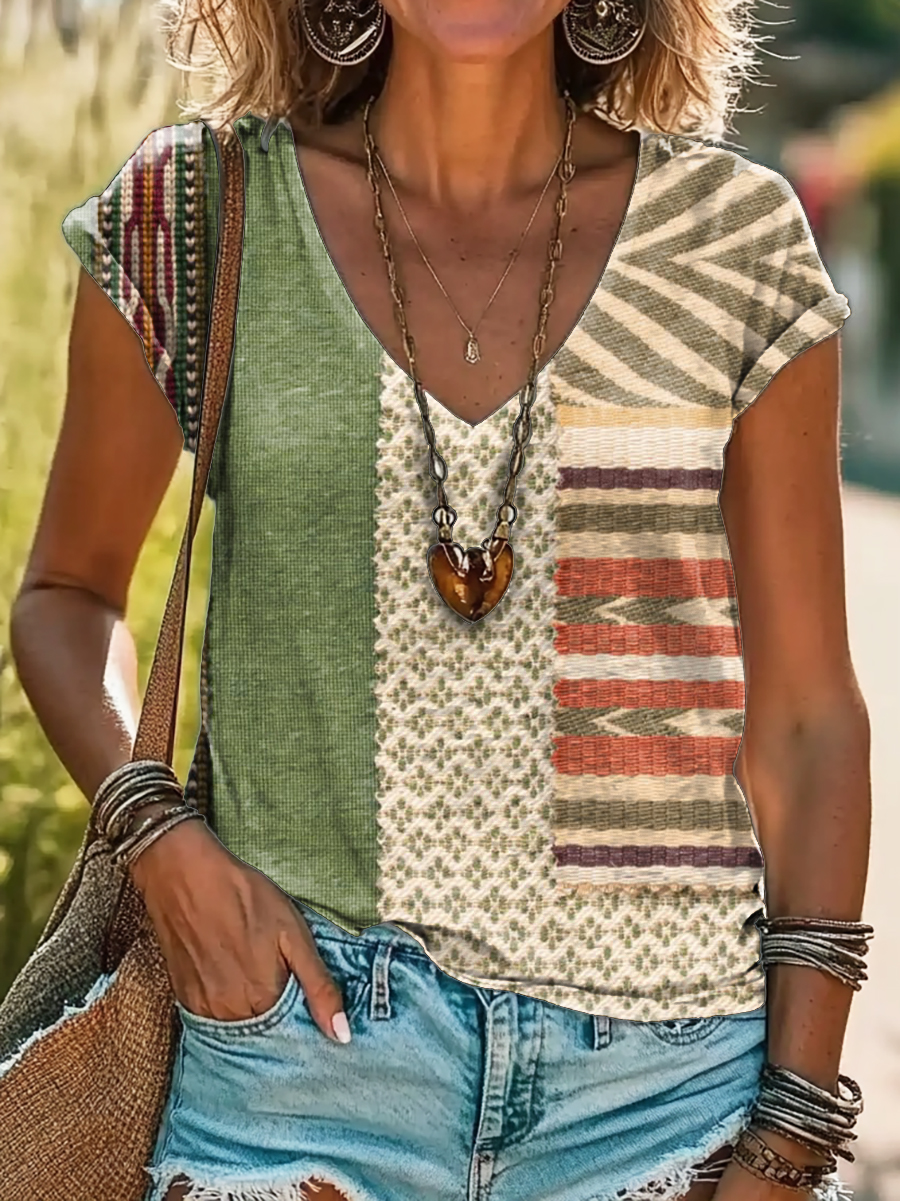 Vintage Bohemian Floral Art Print 100%Cotton V-neck T-Shirt