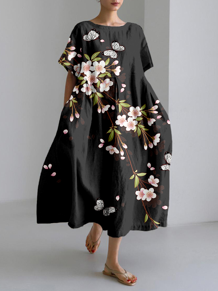 Vintage Cherry Blossom & Butterfly Art Linen Blend Maxi Dress