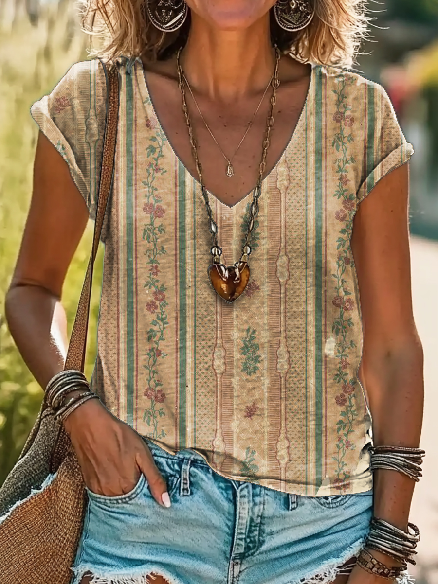 Vintage Ethnic Floral Art Print 100%Cotton V-neck T-Shirt