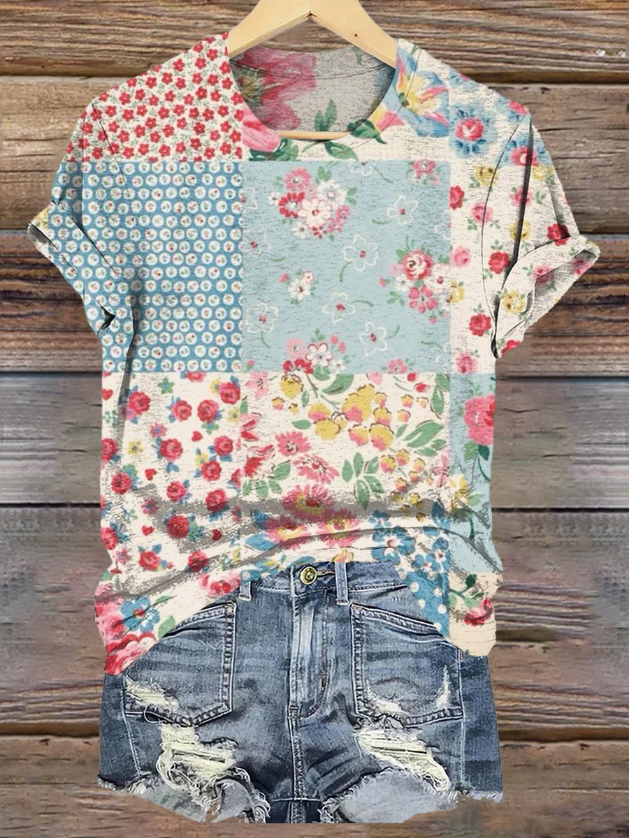 Vintage Floral Patchwork Art Print Casaul Short Sleeve T-shirt