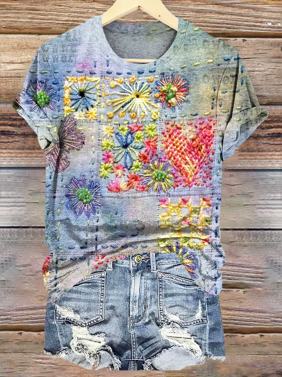 Vintage Quilting Textured Art Patterns Print Crew Neck T-shirt