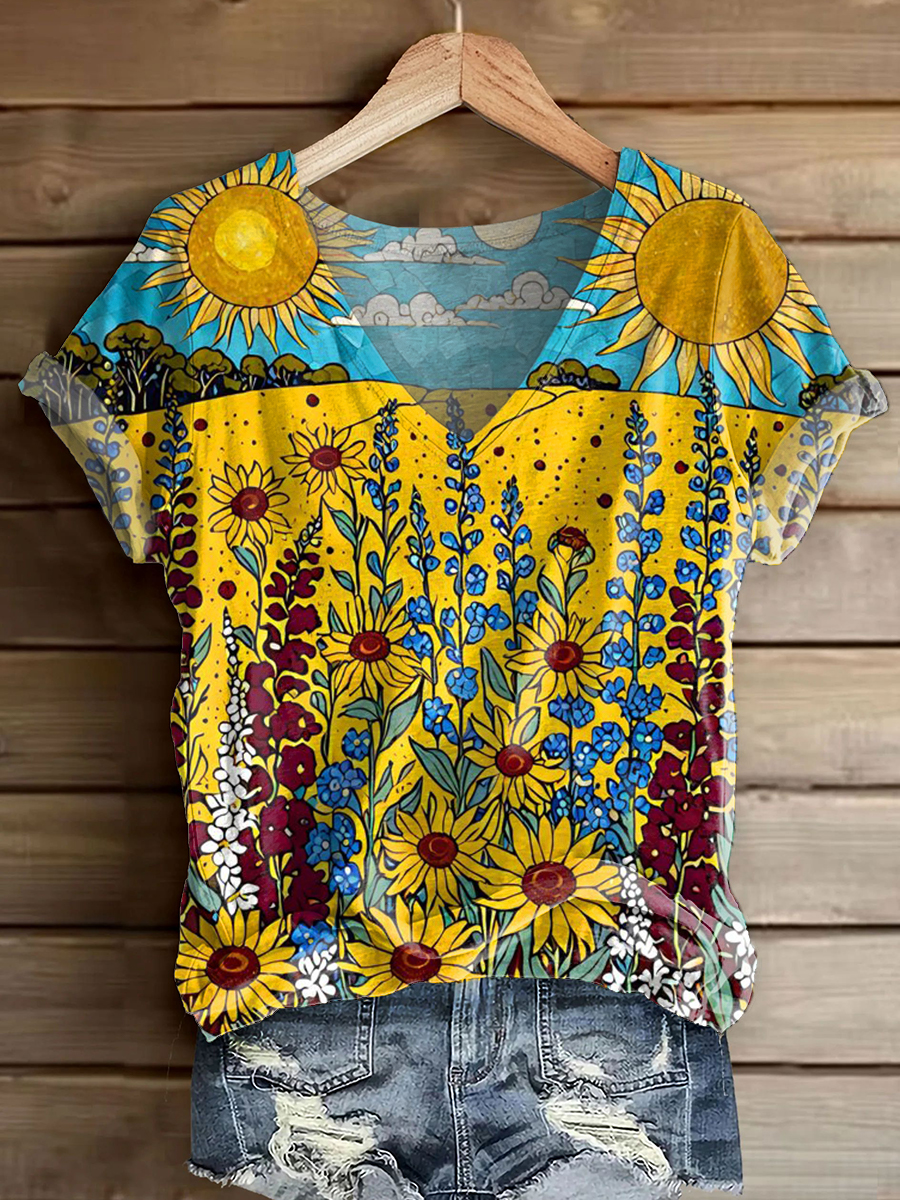 Women's Bohemian Floral Art Print V-neck Casual T-Shirt