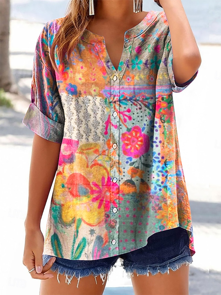 Women's Boho Floral Art Print Casual Cotton And Linen Shirt