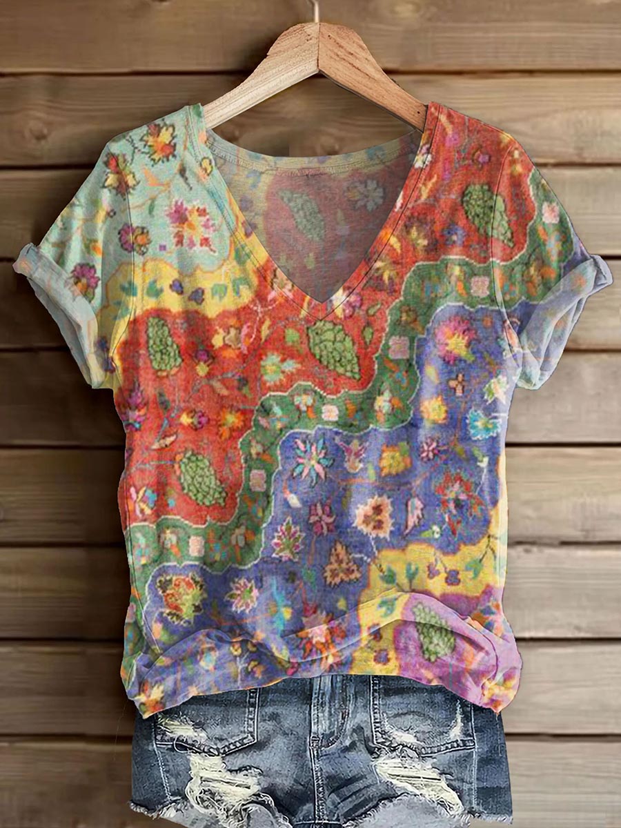 Women's Boho Floral Wave Collage Art Print V-neck Casual T-Shirt