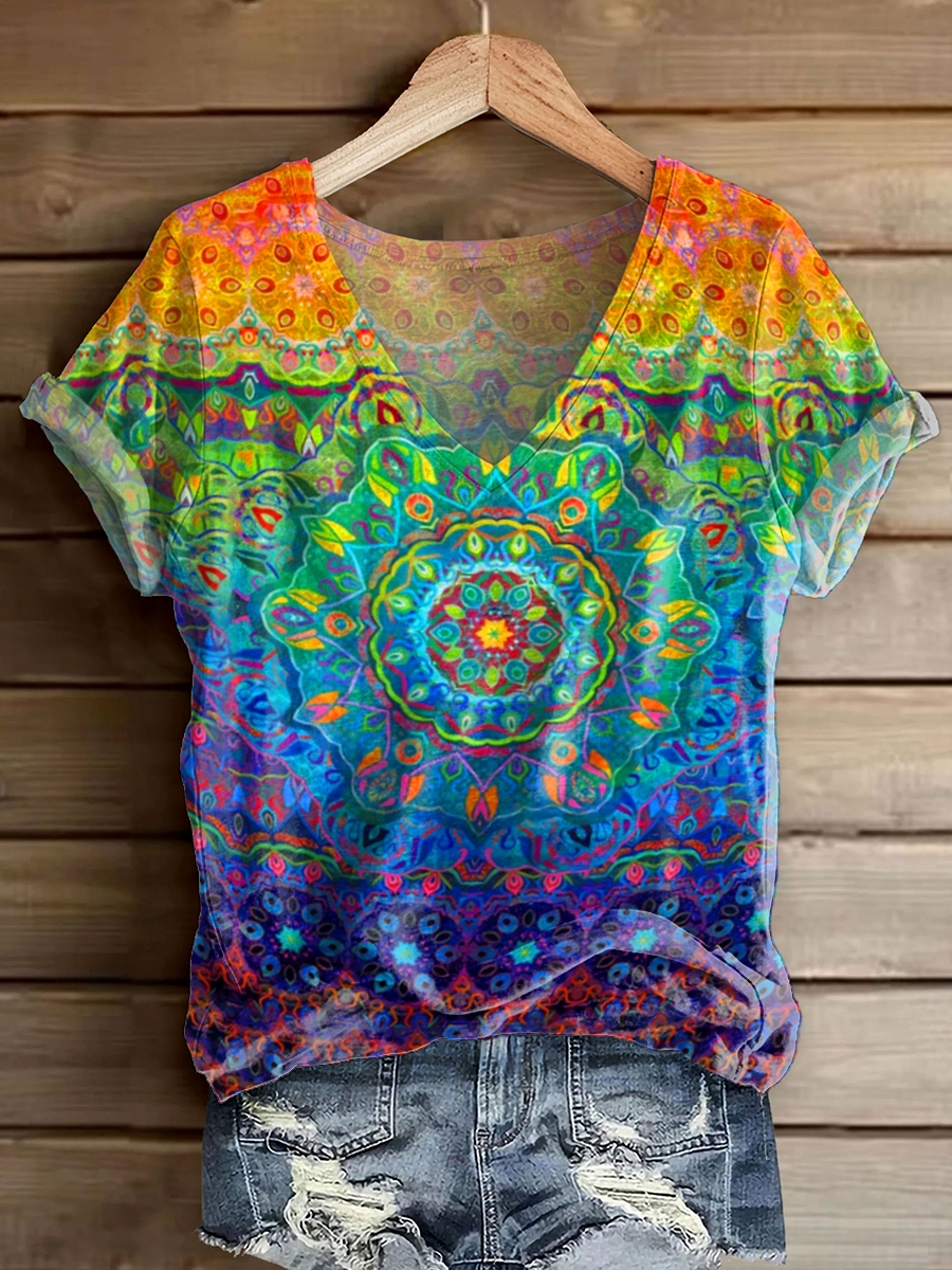 Women's Colorful Mandala Art Print V-Neck Cotton T-Shirt