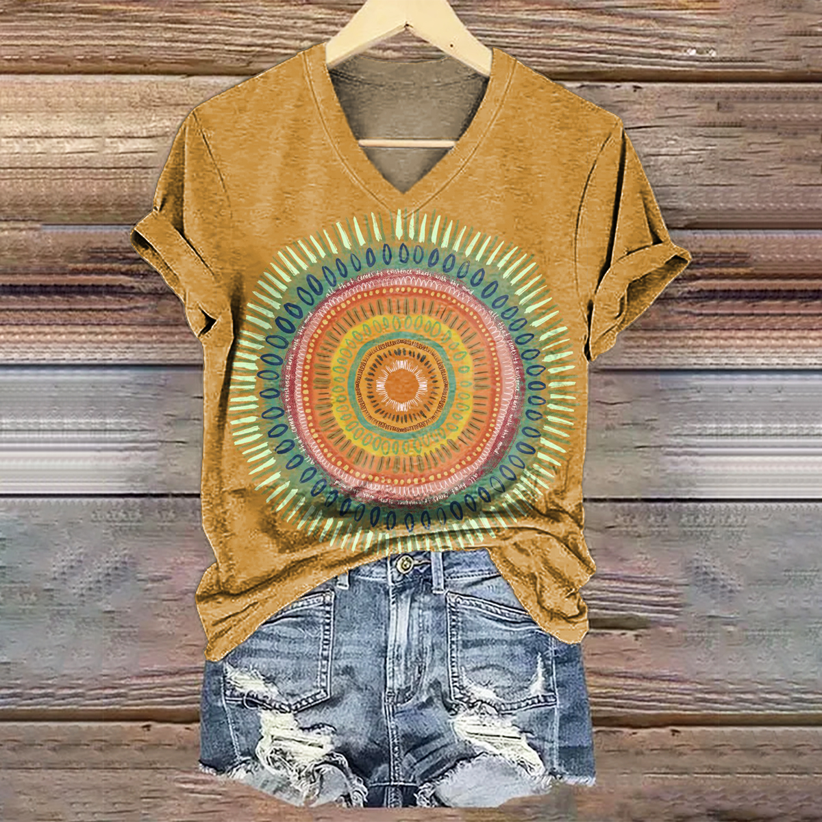 Women's Colorful Mandala Pattern Art Print V-Neck Casual T-Shirt