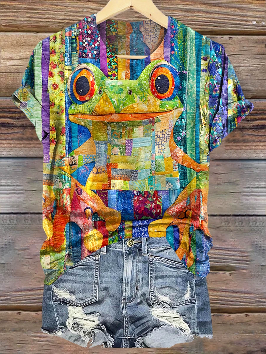 Women's Colorful Trippy Frog Print Crew Neck T-shirt
