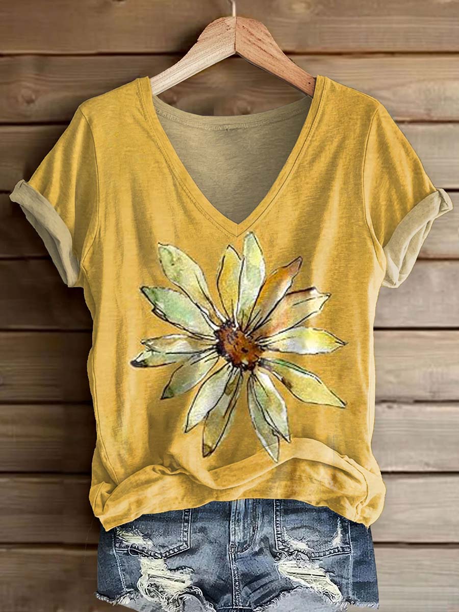 Women's Daisy Art Print V-Neck Casual T-Shirt