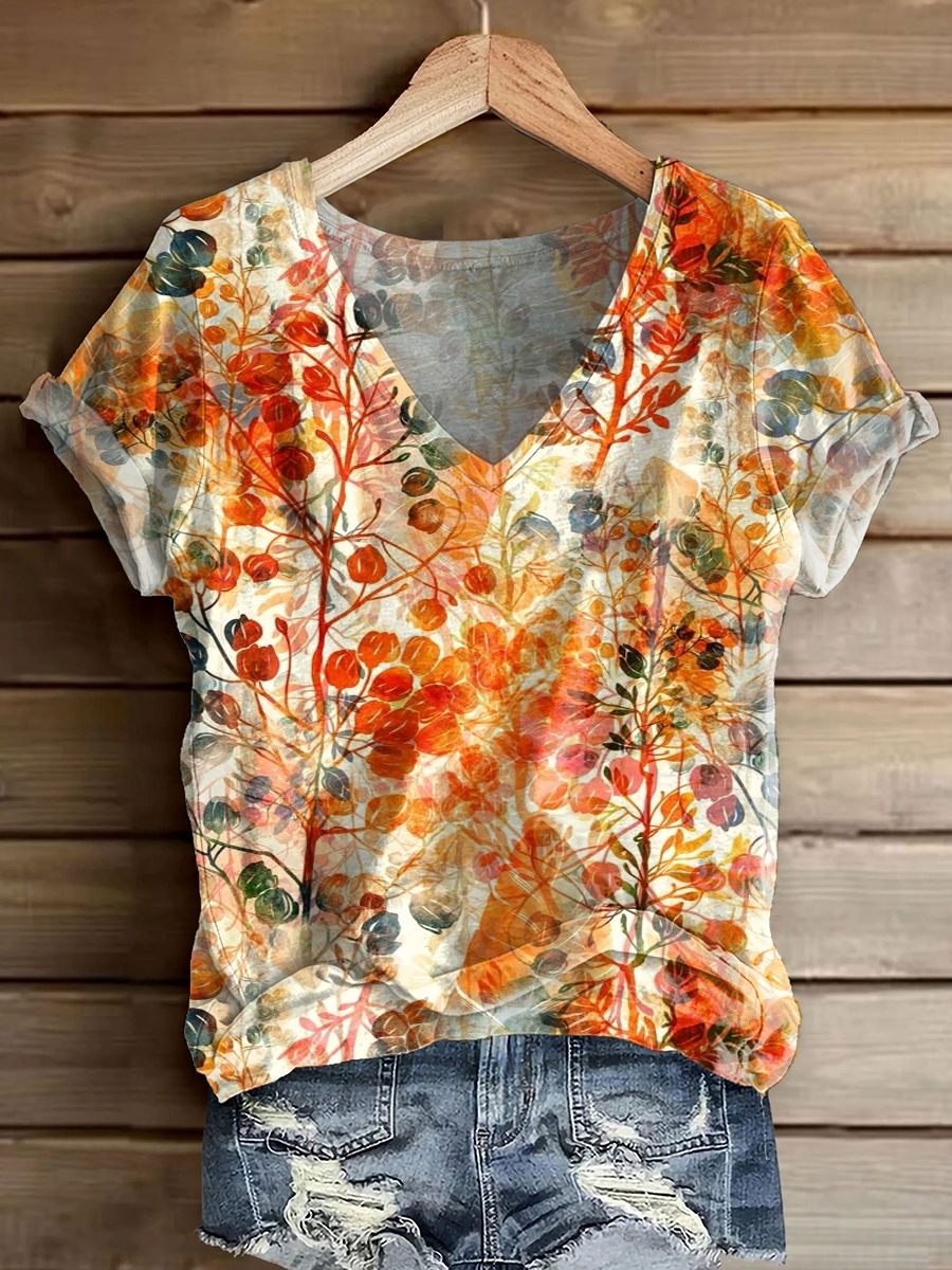 Women's Floral Art Print Casual V Neck Cotton T-Shirt