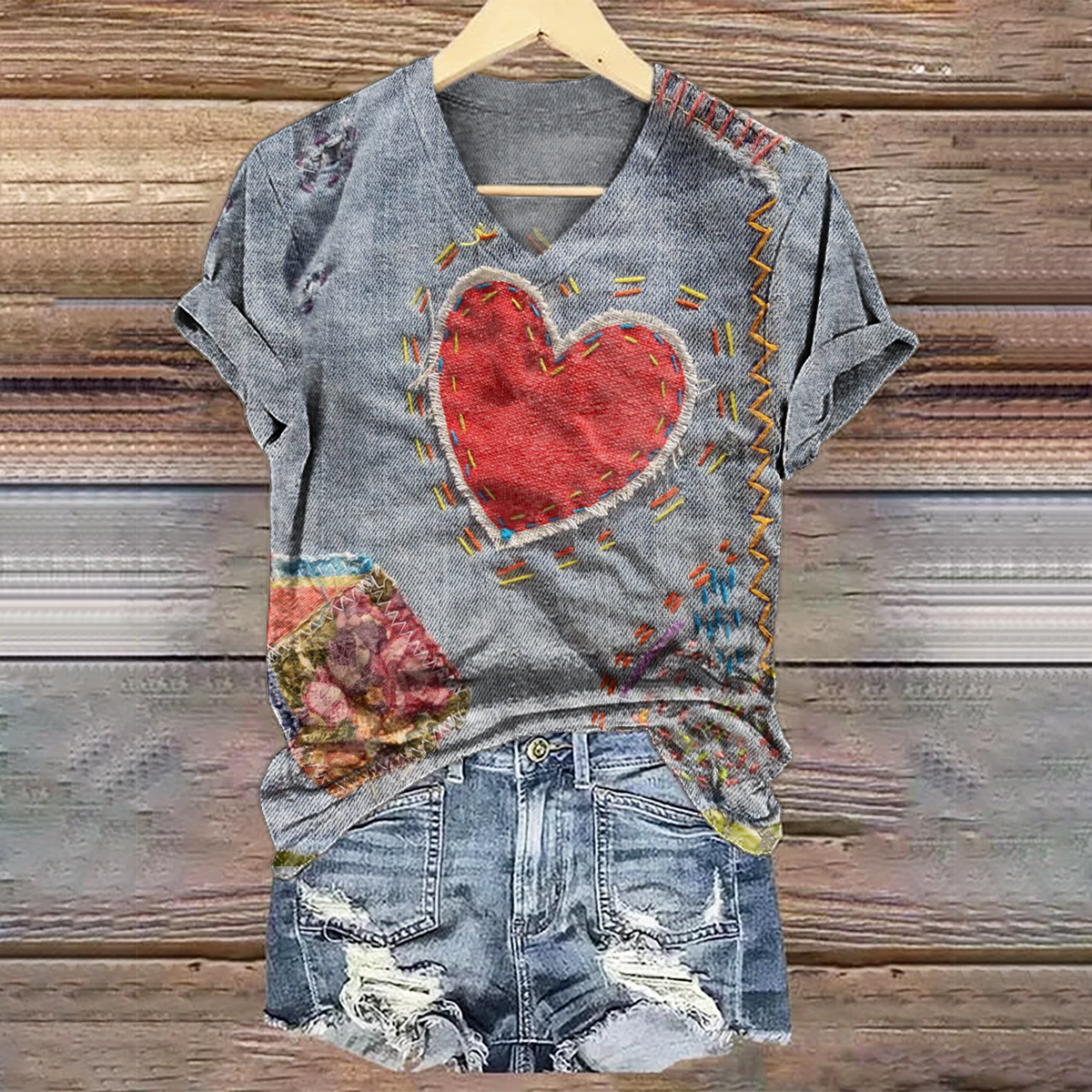 Women's Heart Art Print V-Neck Cotton T-Shirt