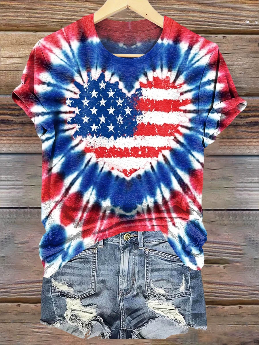 Women's Heart Tie Dye American Flag Independence Day Print Crew Neck T-Shirt