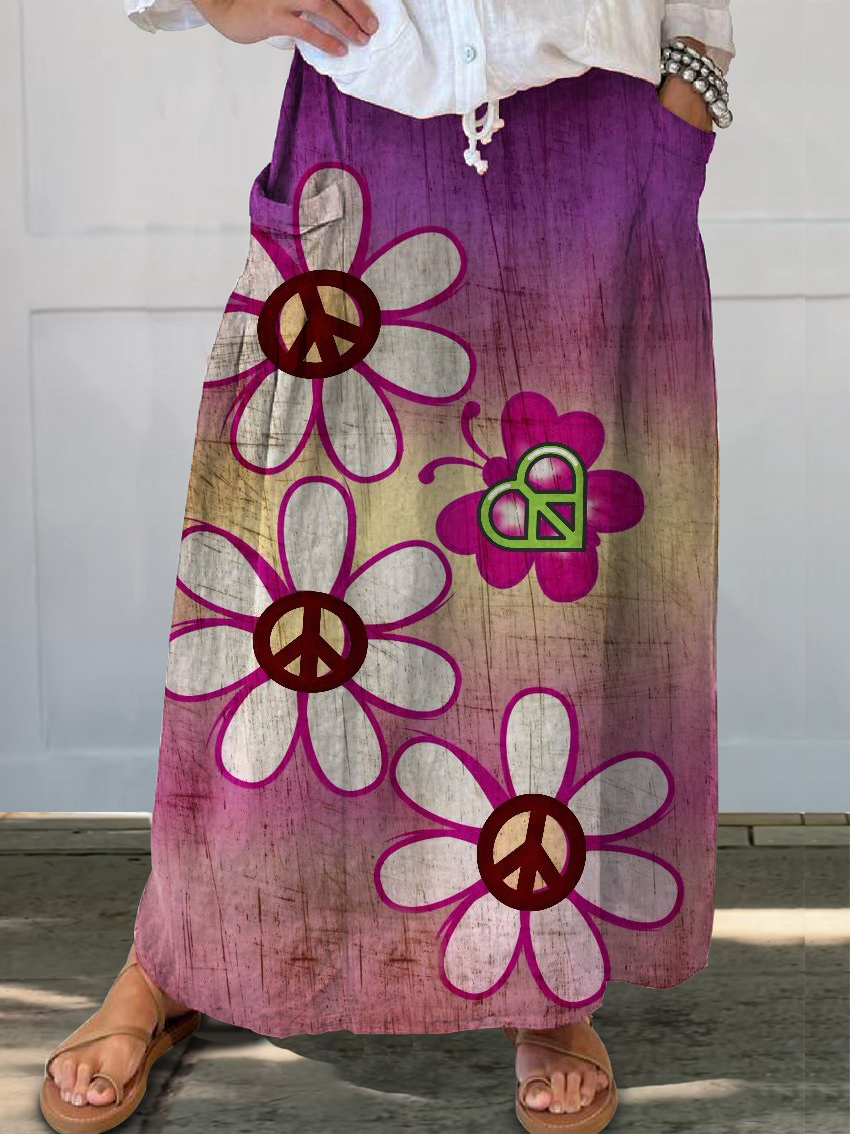 Women's Hippie Floral Art Print Linen Pocket Skirt