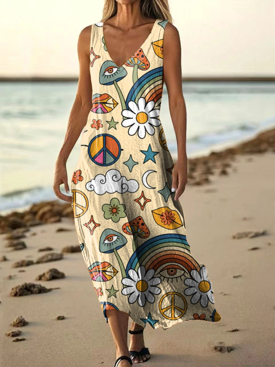 Women's Hippie Pattern Art Print Pocket Cotton Dress