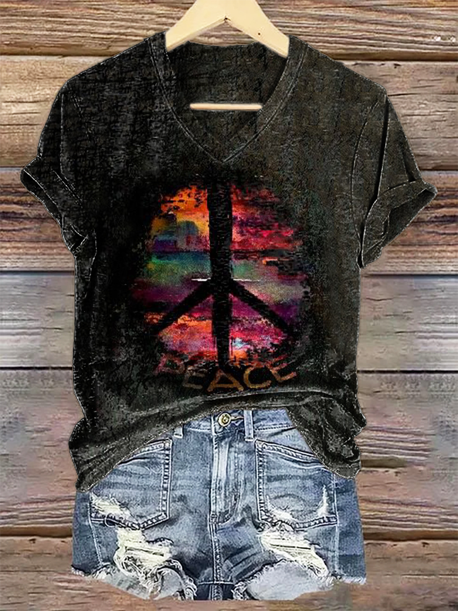 Women's Hippie Peace Art Print V-neck Casual T-Shirt