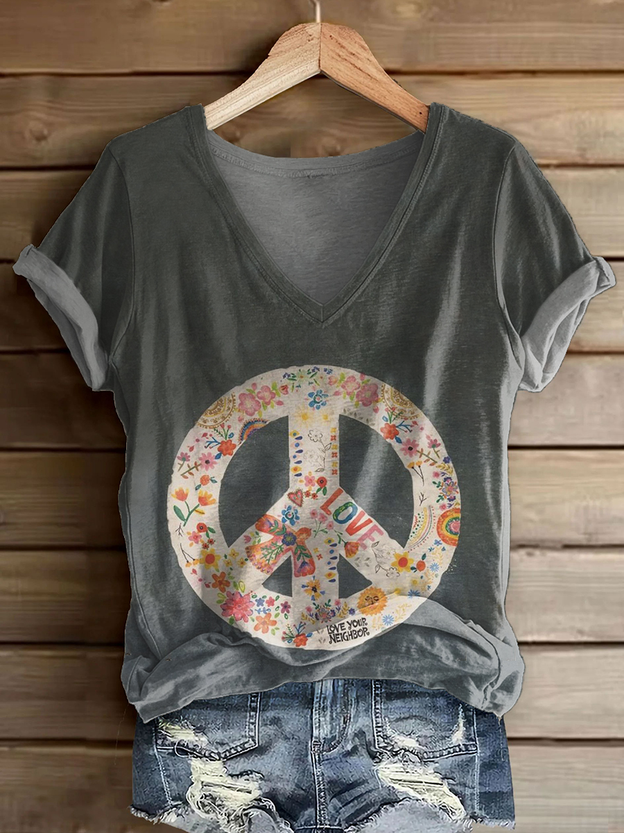 Women's Hippie Peace Love Art Print V-neck Casual T-Shirt
