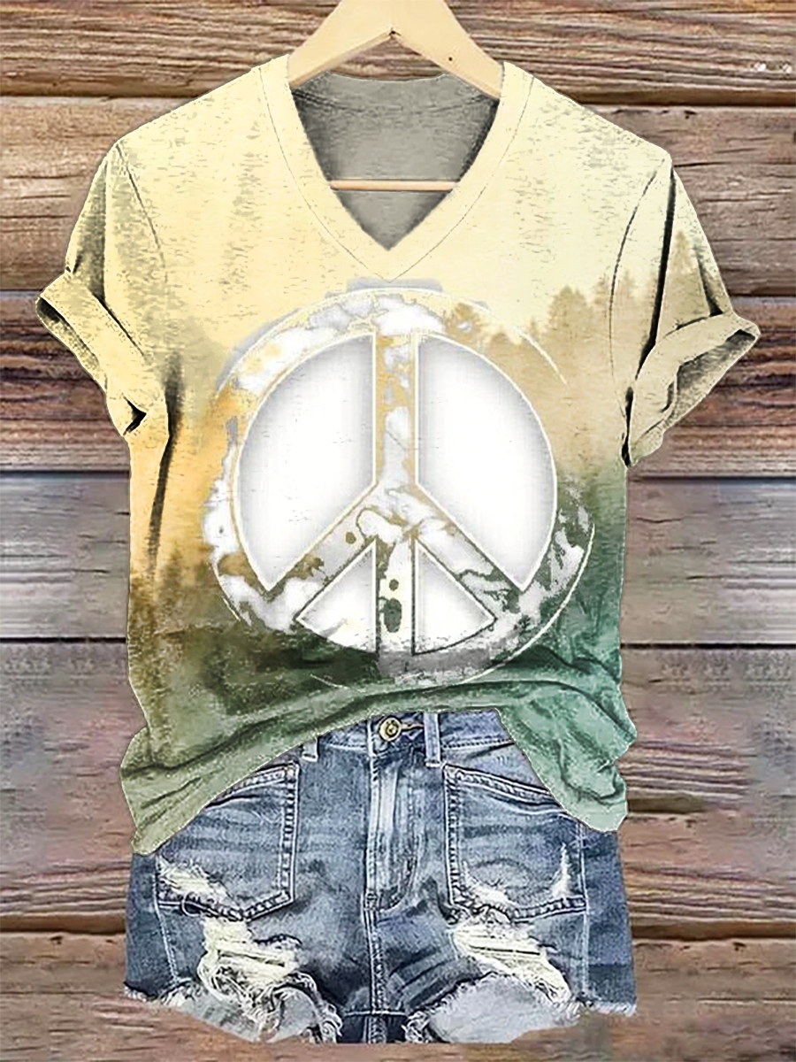 Women's Hippie Peace Love Sign Print V-neck Casual T-Shirt