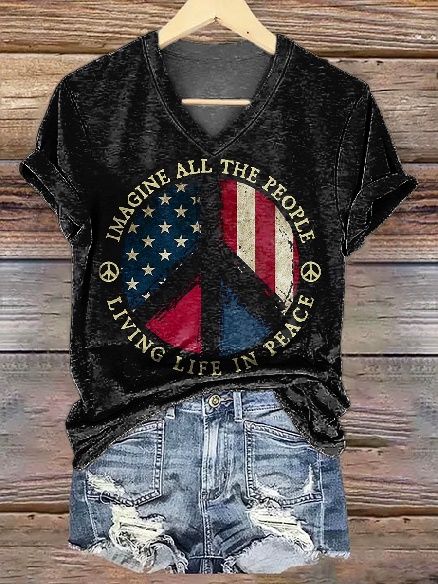 Women's Hippie Peace Patriotic Flag Print V-neck Casual T-Shirt