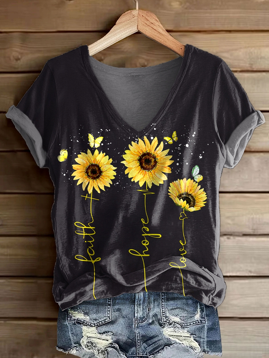 Women's Hippie Sunflower Faith Hope Love Print V-Neck Casual T-Shirt